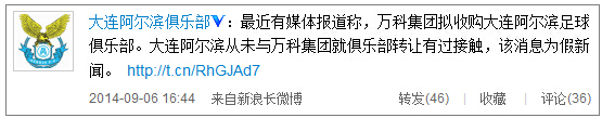 大连阿尔滨官方微博:从未与万科集团就俱乐部转让有过接触