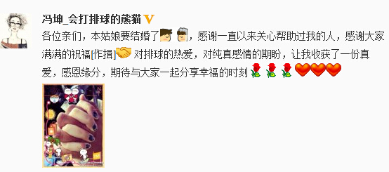 凤凰体育讯 近日在网上曝出前中国女排队长冯坤的将要结婚的消息,引起了大家的关注,很多体育迷们纷纷送上自己的祝福。今日冯坤在自己的微博上亲承了即将结婚的消息,并感谢大家的祝福。【相关推荐:冯坤恋情在圈内是公开的秘密 两人12年前世锦赛相识】