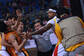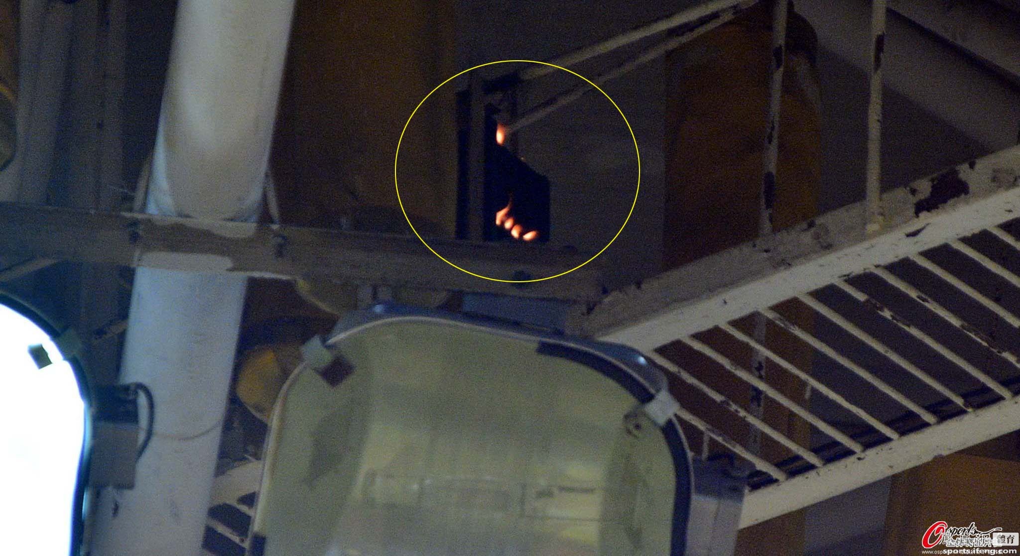 北京时间12月26日,CBA常规赛第24轮,江苏南钢主场大胜四川。比赛的最后时刻,江苏主场南钢体育馆顶部突然着火,有东西落在了正下方的技术台,一度引发混乱。图为现场着火的灯具。