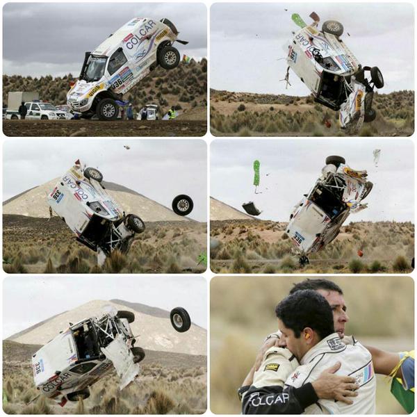 事故发生在第7赛段从伊基克到乌尤尼的一段,这一段不仅路程长,且海拔高,加之最近天气状况不好,下雨后使得路面十分泥泞,车手们稍有不慎就会发生事故,结果阿根廷车手帕托-席尔瓦和加拿大人马修-坎贝尔就在上周末发生意外,而一位在路边观战的车迷恰好用摄像机记录下了全过程。