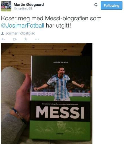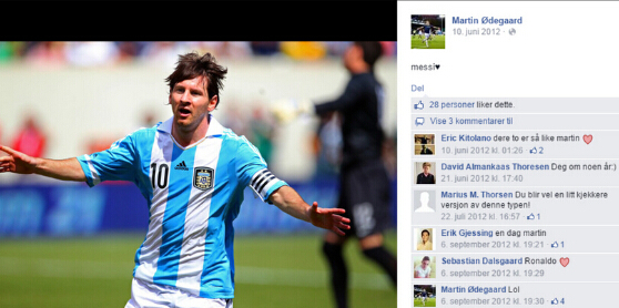 虽然这位欧洲最红新星吸引了包括巴萨、曼联、曼城、利物浦、切尔西、阿森纳、拜仁、多特等多支豪门球队的关注,但是奥德加德最终决定加盟皇家马德里。绰号“挪威梅西”的他曾将梅西视为自己的偶像,在推特和Facebook上表达对于梅西的崇拜,不过有趣的是在加盟皇马之后,他已经把自己推特和Facebook上关于梅西的内容删掉。![]()