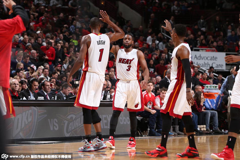 北京时间1月26日,热火在客场以96-84击败公牛。热火二连胜。德维恩-韦德拿下了26分,克里斯-波什20分7个篮板,马里奥-查尔默斯15分5次助攻,洛尔-邓第一次以客队球员的身份来到芝加哥,面对老东家拿下了15分10个篮板。哈森-怀特塞德复出,替补出场,打出三双,贡献14分、13个篮板和12个盖帽。热火全队13次盖帽。图为韦德波什庆祝。