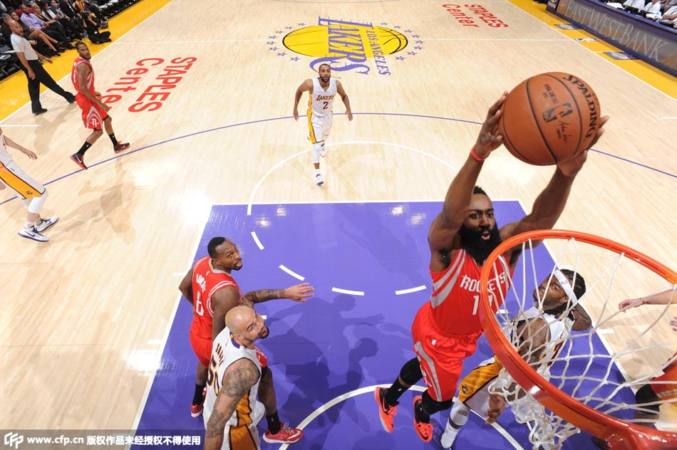 凤凰体育讯 北京时间1月26日,NBA常规赛继续展开,尽管湖人末节一度打出16-2的高潮,但还是难挡败局,87-99不敌火箭后,湖人惨遭8连败,火箭则收获两连胜。全场比赛,火箭3分球疯狂出手44次,命中13球,虽然命中率只有29.5%。但湖人总共才出手了13次3分,命中1球,差距显而易见。上一场被雪藏之后,林书豪今天替补上场,得到14分6助攻。图为哈登突破双手暴扣。