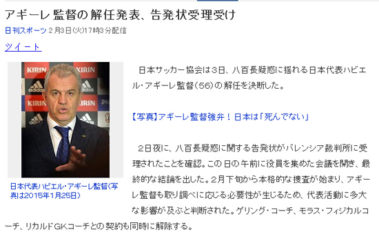 身有假球污点而且又未能带领球队取得理想的成绩,阿吉雷成为了日本国内媒体讨伐的对象。而日本足协祖最终也决定解雇阿吉雷。