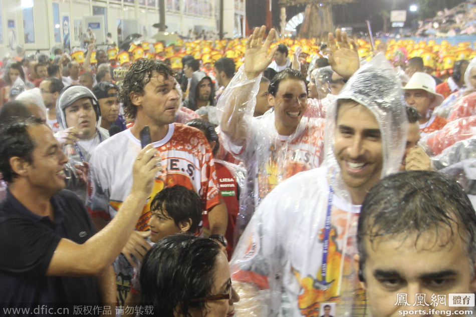 当地时间2015年2月15日,巴西里约热内卢,纳达尔、费雷尔、库尔滕参加里约狂欢节大游行。