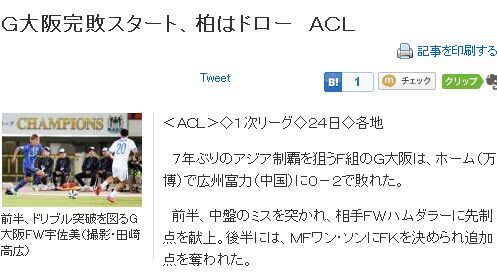 北京时间2月24日消息,2015年亚冠联赛F小组第1轮赛事,广州富力队客场挑战大阪钢巴队。最终经过90分钟的激战,广州富力队在客场以2-0战胜大阪钢巴队,赢得了亚冠联赛小组赛开门红。赛后日本媒体无不对他们的三冠王首战出师不利表达了遗憾,而日本球迷则表达了不服气的情感。
