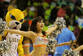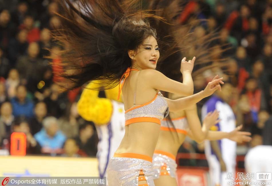 2015年3月10日,辽宁本溪,14/15赛季CBA总决赛首场,辽宁衡润VS北京首钢。辽宁队啦啦宝贝超短裙热舞,看呆吉祥物。