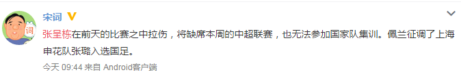 在与浦和红钻的亚冠比赛中,张呈栋就感觉腿部有些不适,但因为感觉不明显,所以也没有特意去检查。18日上午,张呈栋随受伤的宋博轩和赵和靖一并去检查,结果显示拉伤。据悉郑智是在亚冠比赛中受伤的,佩兰已经征调了河南建业的顾操顶替郑智。