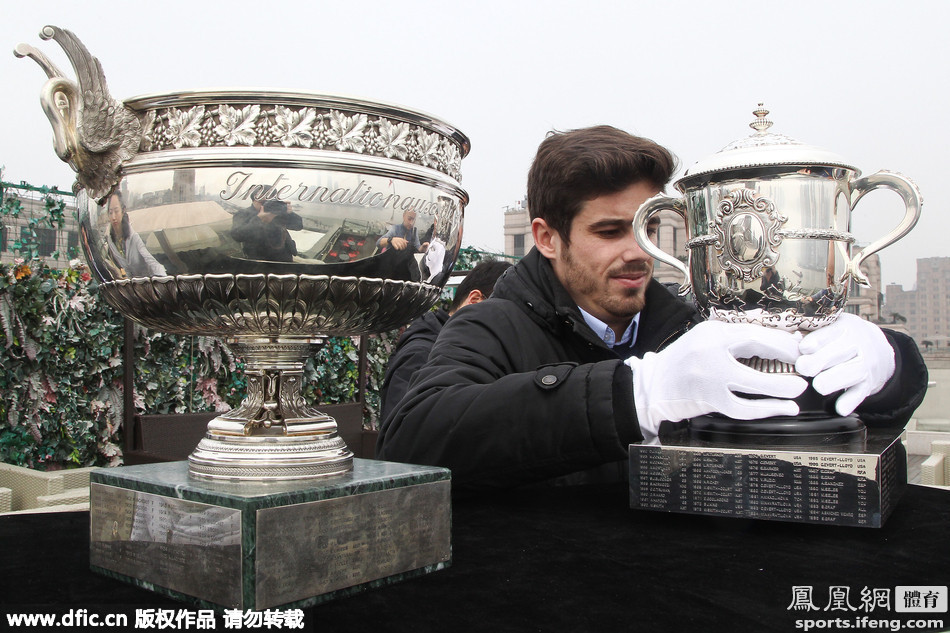 2015年3月19日,上海,法网单打冠军奖杯抵沪,这也是该奖杯首次来到上海。法网男女单打冠军奖杯分别是火枪手杯(Mousquetaires Cup)和“苏珊-伦格朗杯(Suzanne Lenglen Cup)。图为19日上午工作人员将奖杯安放在外滩罗斯福顶楼平台。