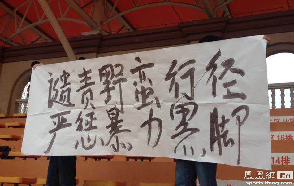 2015年04月13日,山东省济南市,山东鲁能预备队2-1战胜富力。鲁能球迷在比赛场边打横幅抗议裁判在中超鲁能对阵富力中判罚不当,导致本队三名球员骨折。