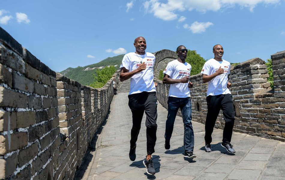 2015年5月15日上午,国际田坛传奇人物科林-杰克逊、迈克-鲍威尔和迈克尔-约翰逊来到北京慕田峪长城游览并体验中国传统文化。