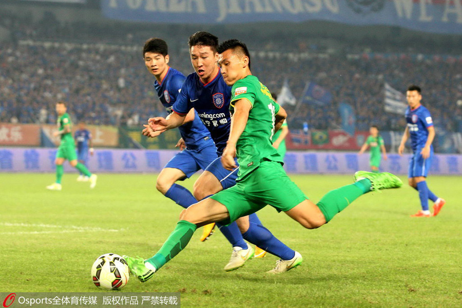 北京时间5月23日,2015赛季中超联赛继续第11轮争夺。19点35分,江苏舜天队坐镇主场迎来北京国安队的挑战。上半场比赛吴曦浪费单刀机会,马季奇的补射击中门框弹出,下半场曼萨诺换上德扬、巴塔拉但都没能改变局面,最终双方0-0互交白卷。于大宝比赛中。