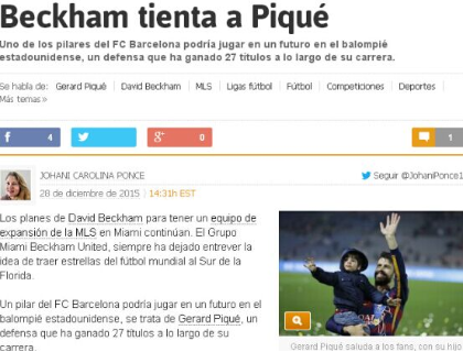 此外,贝克汉姆正劝说皮克加盟美国职业大联盟,因为小贝将在2017年组建一支美职联球队,此前,贝克汉姆已经向伊布发出邀请。西媒还表示,因为夏奇拉的原因,皮克完全有可能去到美国发展事业。