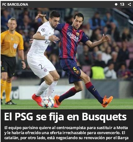 西媒报道称,“大巴黎希望引进布斯克茨,用来取代逐渐老去的莫塔,为此,大巴黎愿意开出天价,据悉,这份报价高到让人难以抗拒。当然,放走布斯克茨对于巴萨来说是艰难的决定,他是恩里克战术体系的重要一环,也是一名顶尖球员和球队队长。”
