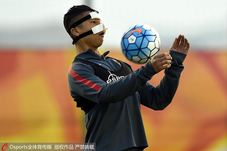 中国国奥抵达多哈首练 张玉宁变身面具侠