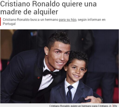 2010年南非世界杯结束没多久,C罗就在Facebook上宣布自己已为人父,儿子取名克里斯蒂亚诺-罗纳尔多-多斯桑托斯,但对儿子生母的身份保密,这突如其来的消息在当时震了足球界。有报道称C罗的儿子是一个代孕妈妈生的,但也有媒体报道,迷你罗的妈妈是美国的一位服务员,现在仍然居住在洛杉矶。据悉,C罗给了女服务员1000万美元,让她不要对外披露自己的身份,并把孩子交给自己。