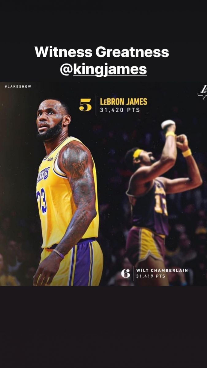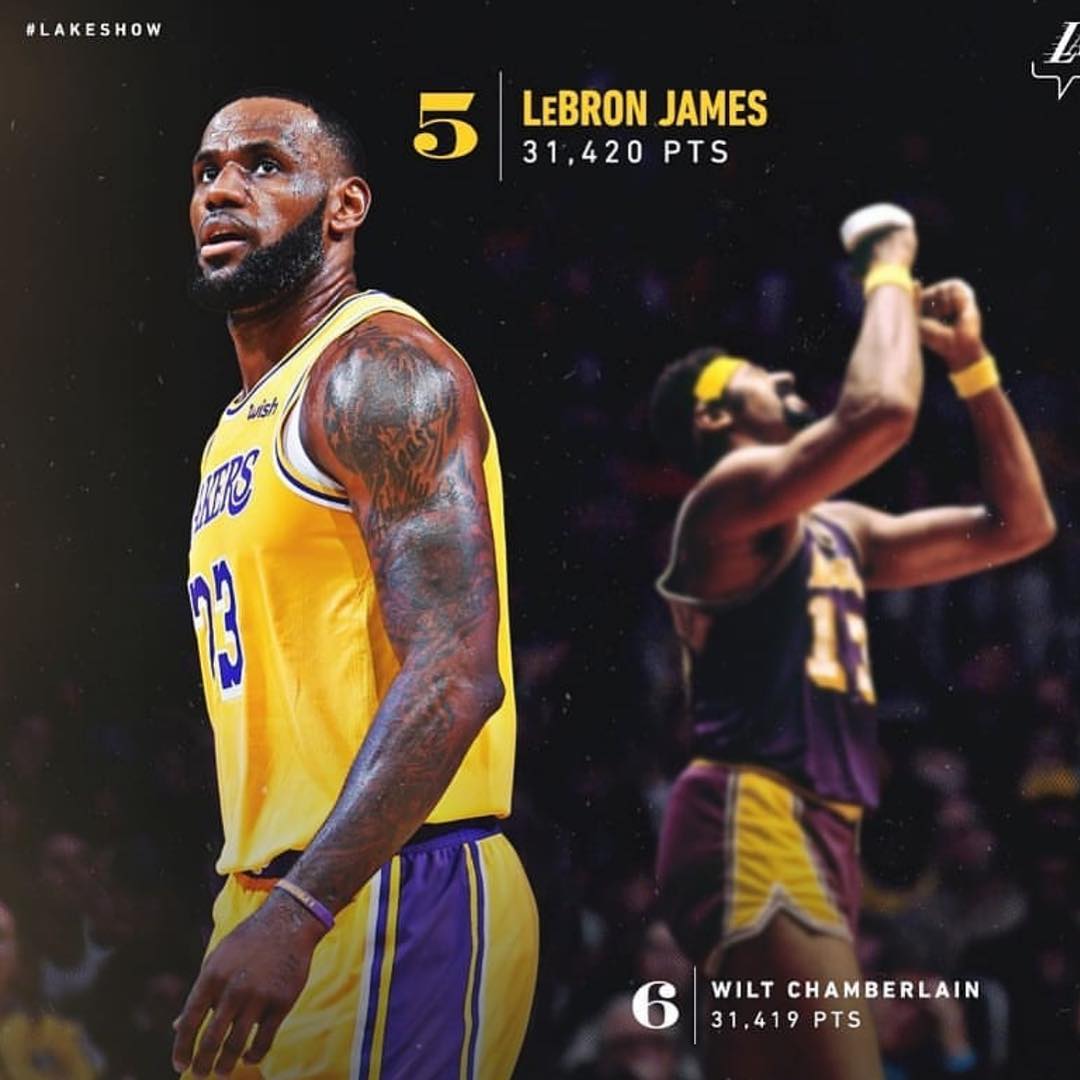 虎扑11月15日讯 湖人今日常规赛在主场以126-117战胜开拓者,本场比赛湖人球员勒布朗-詹姆斯得到44分,职业生涯总得分来到了31425分,超越威尔特-张伯伦升至历史第5位,赛后魔术师约翰逊等人也纷纷发文祝贺詹姆斯。