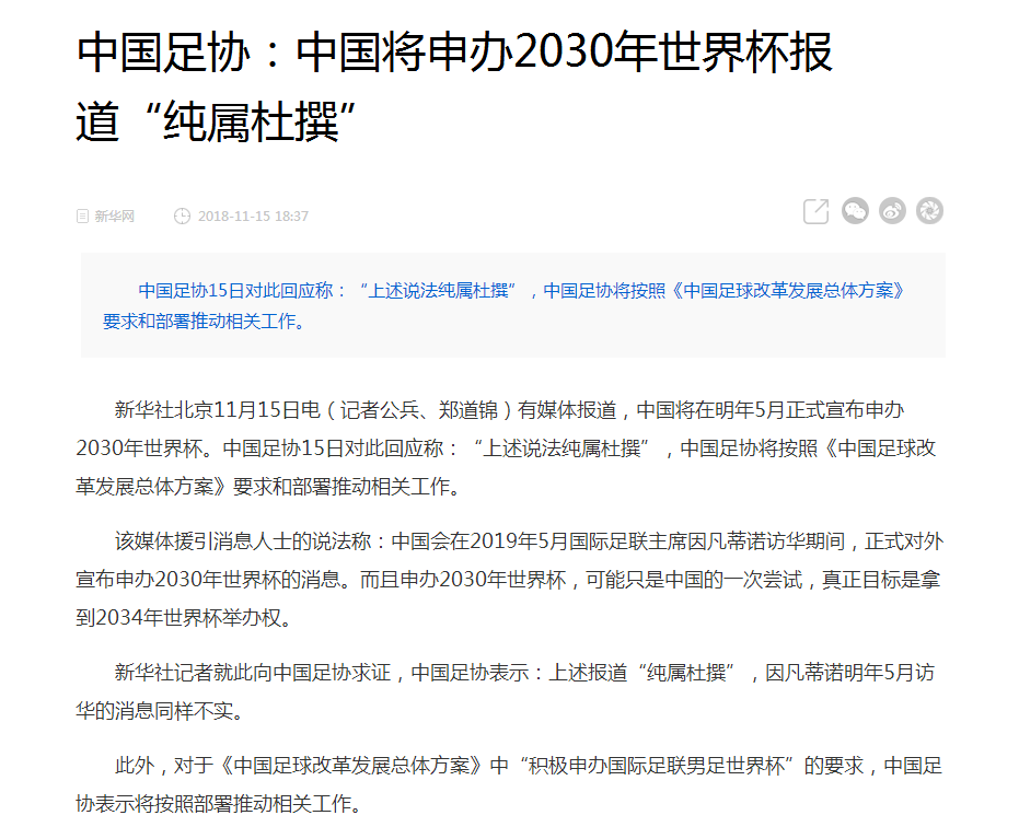 足协又辟谣了!中国申办2030年世界杯是假消息