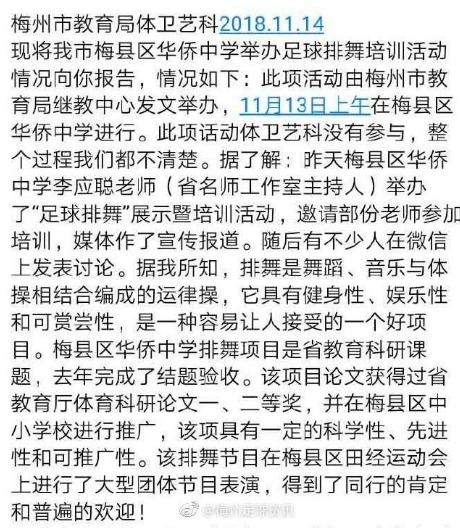 梅州市全面推广中小学足球舞蹈在网络上炸开了锅,引发了社会的广泛关注,梅州市教育局局昨日做出了回应:“据我所知,排舞是舞蹈、音乐与体操相结合变成的韵律操,它具有健身性、娱乐性和可观看性,是一种容易让人接受的好项目。”“该项目论文获得过省教育厅教育科研一,二等奖。”“得到了同行的肯定和普遍的欢迎”