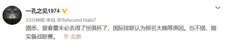 随后,《北京晚报》的著名体育记者孔宁老师也通过社交平台发布了有关曾春蕾可能无缘代表浙江女排出战世俱杯的消息,他写道:“据悉,曾春蕾未必去得了世俱杯了,国际排联认为报名太晚等原因。也不错,踏实备战联赛。”