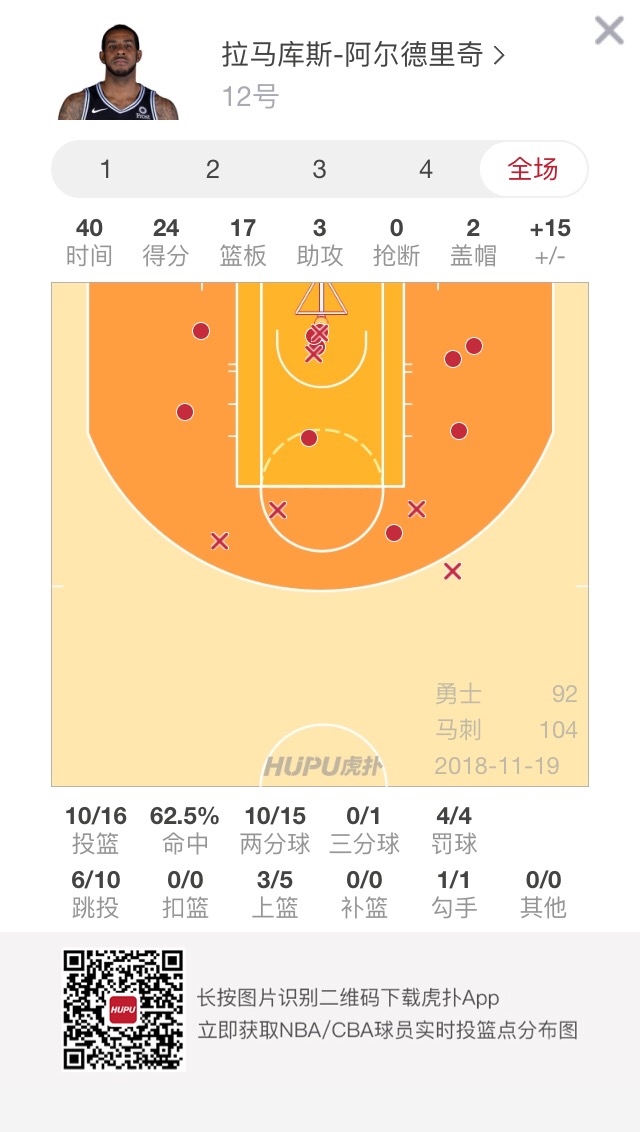 本场比赛,阿尔德里奇上场40分钟,16投10中,得到24分17篮板3助攻2盖帽。