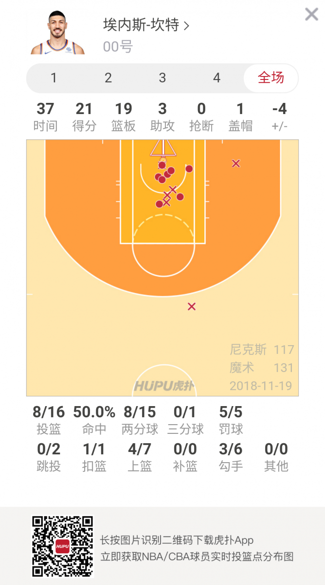 此役,尼克斯内线埃内斯-坎特上场37分钟,16投8中,罚球5中5,得到21分19篮板3助攻1盖帽,其中贡献8个前场篮板。