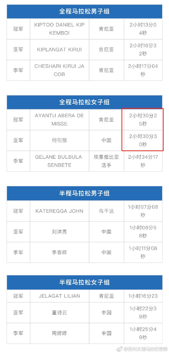 最终比赛结果,埃塞俄比亚选手德米塞以2小时30分25秒的成绩夺得全马女子组冠军,中国选手何引丽以2小时30分30秒的成绩获得第二名。