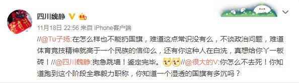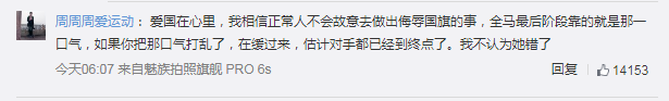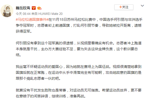 “爱国在心里,我相信正常人不会故意去做出侮辱国旗的事,全马最后阶段靠的就是那一口气,如果你把那口气打乱了,缓过来,估计对手都已经到终点了。我不认为她错了”。