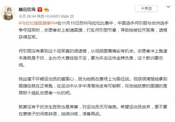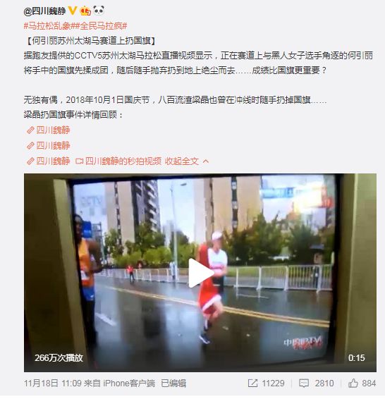 事后,有微博认证为田径(马拉松)二级运动员的博主@四川魏静发文指责“何引丽苏州太湖马赛道上扔国旗”,称,“据跑友提供的CCTV5苏州太湖马拉松直播视频显示,正在赛道上与黑人女子选手角逐的何引丽将手中的国旗先揉成团,随后随手抛弃扔到地上绝尘而去……成绩比国旗更重要?”