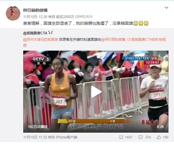 而身处漩涡中央的何引丽,却一直很平静,除赛后在微博解释为何掉国旗外,再无表态,她在微博解释道:“谢谢理解,国旗全部湿透,我的胳膊也跑僵了,没拿稳国旗(并配上三个哭泣的表情)”。