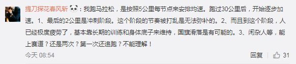评论中,一位有过跑马拉松经验的网友表示,“我跑马拉松,是按照5公里每节点来安排均速。跑过30公里后,开始逐步加速。1、最后的2公里是冲刺阶段。这个阶段的节奏被打乱是无法弥补的。2、而且到这个阶段,人已经极度疲劳了,基本靠长期的训练和身体底子来维持,国旗滑落是有可能的。3、闲杂人等,能上赛道?还是两次?第一次还追跑?不能理解!”