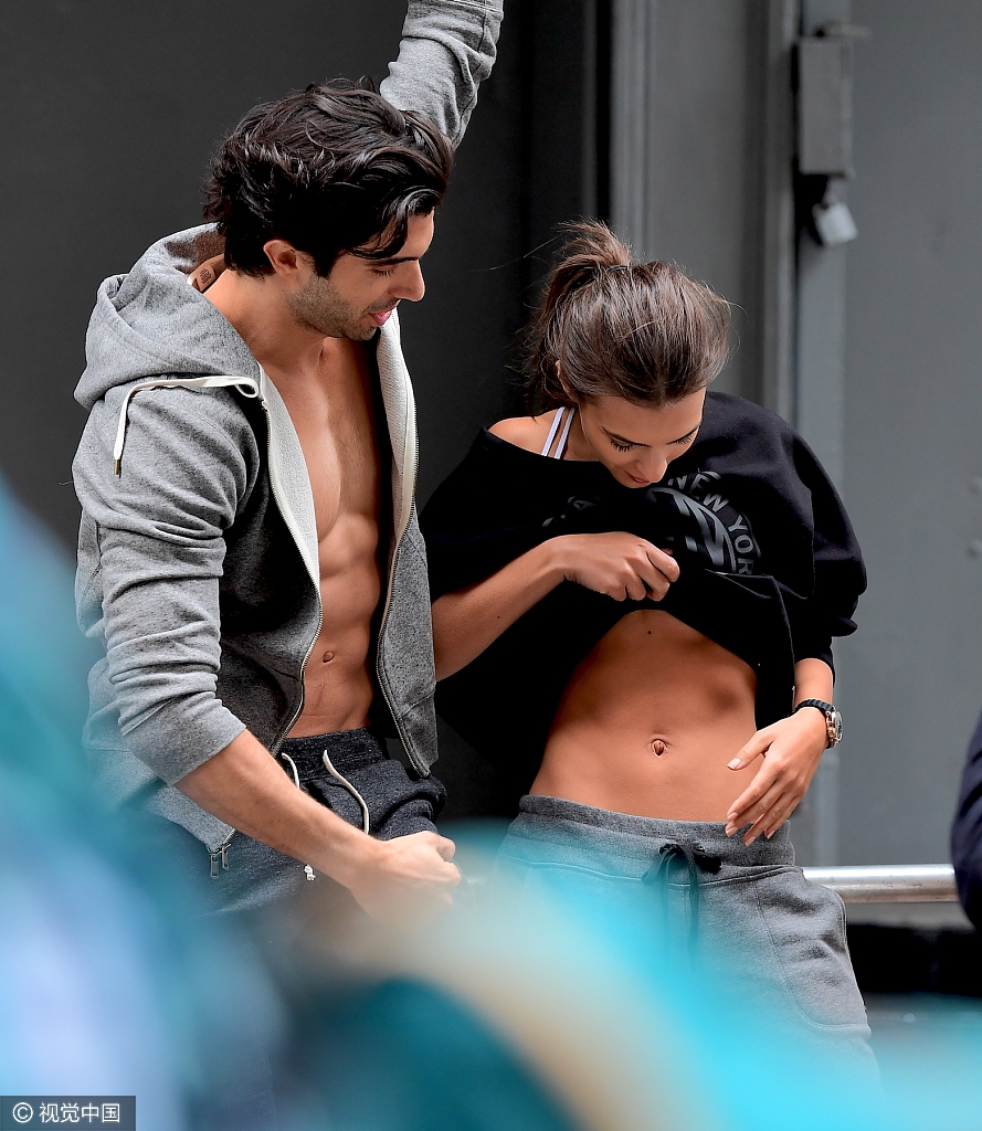 当地时间2017年4月24日,纽约,超模艾米丽·拉塔科夫斯基(Emily Ratajkowski)为谋品牌拍摄广告宣传照。她身着运动背心俯身狂挤乳沟展傲人双峰,撩衣褪裤展马甲线与性感男模相拥大笑,随性坐路边与萌狗玩耍玩转慵懒风。