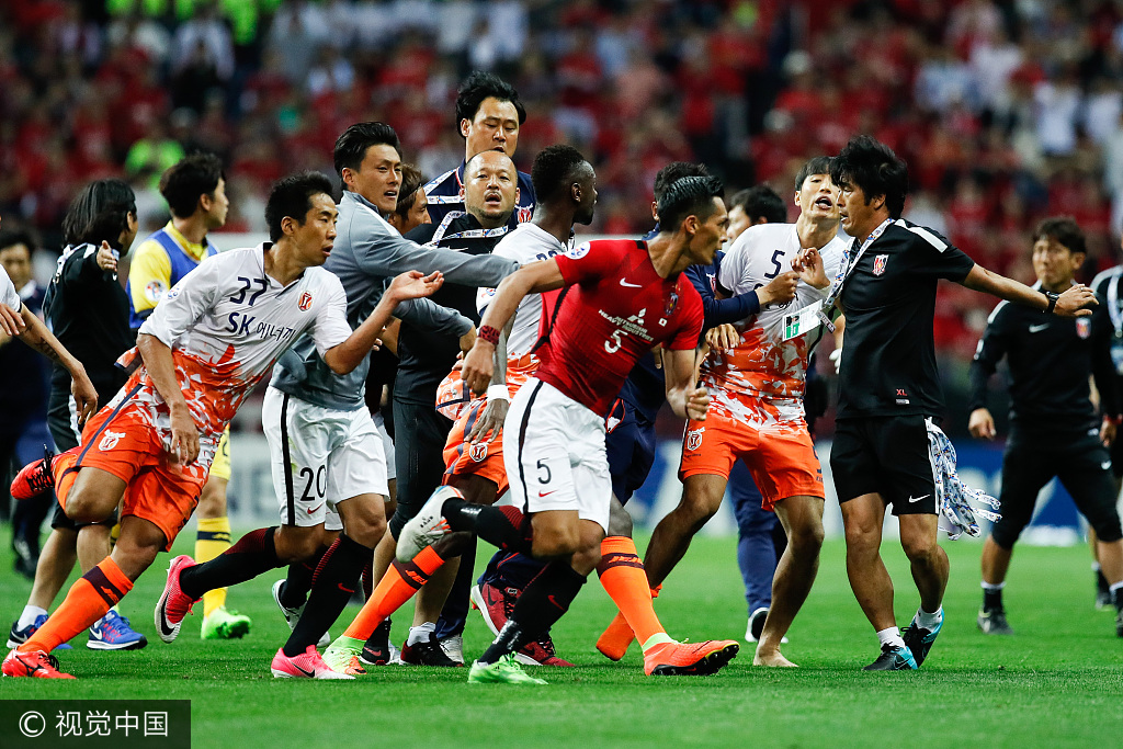 2017年5月31日,日本,2017亚冠1/8决赛次回合,浦和红钻3-0济州联。双方球员发生激烈冲突,济州联球员郑澐追打槙野智章。