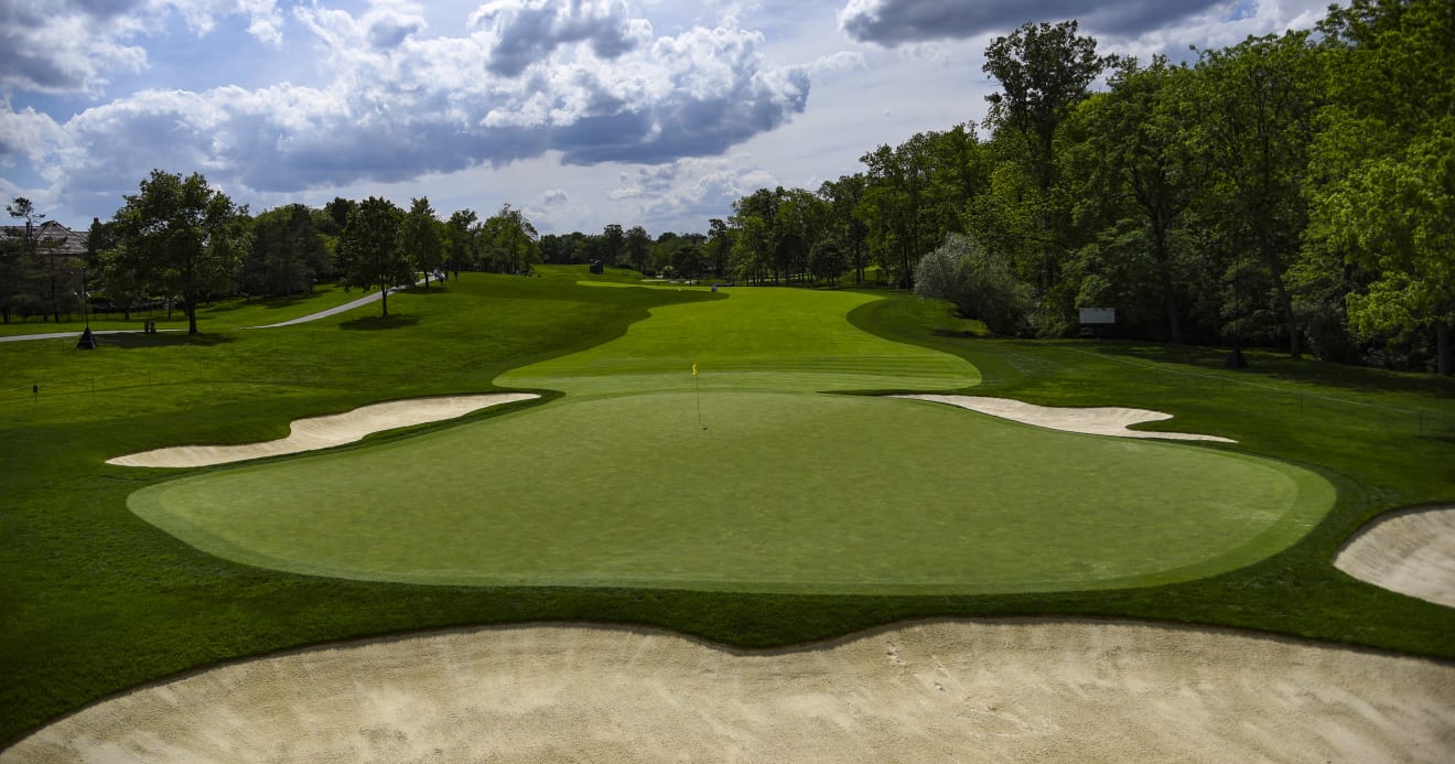 本周纪念高球赛即将在缪菲尔德山庄高尔夫俱乐部展开激烈争夺,缪菲尔德乡村俱乐部是金熊尼克劳斯球场设计生涯的起始地,也是他的代表作之一。/n图为1号洞 4杆洞 470码