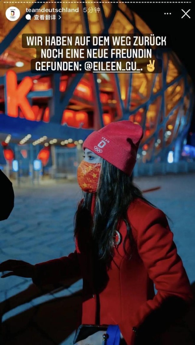 看到这一幕之后,德国代表团也在社交媒体公布了带着德国代表团保暖帽的谷爱凌的图片,并且写道,“在回去的路上,我们遇到了一个新朋友。”