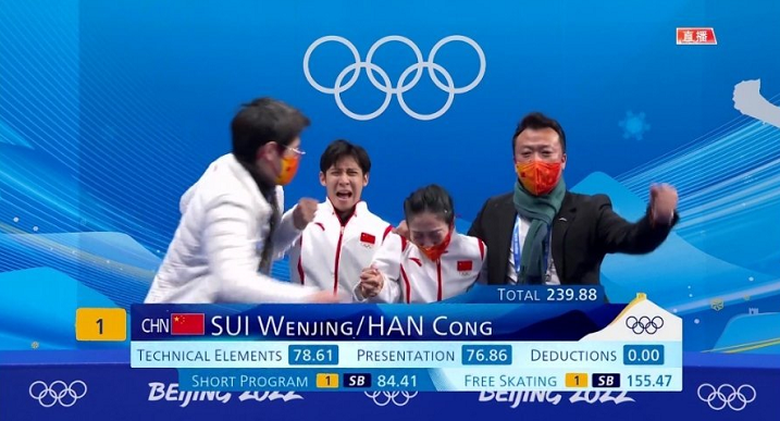 当《忧愁河上的金桥》结束,隋文静和韩聪结束了自己的表演,葱桶组合技术分78.61分,节目内容分76.86分,总分155.47分,位居所有选手的第一名。再加上短节目创世界纪录的84.41分,隋文静和韩聪以总成绩239.88分夺得金牌,两人、教练和代表团的成员都哭了,葱桶组合压轴出场,顶住巨大的压力,成功拿下金牌,恭喜隋文静和韩聪。