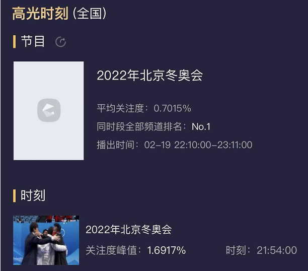 这场比赛的收视率超高,这也是公认的中国队最有希望冲击金牌的点,所以巅峰时刻的收视率出现在葱桶组合出场,电视台的收视率高达1.6917%,同时间段排名全国第一,足以看出大家对于隋文静和韩聪的关注程度,是非常高的。